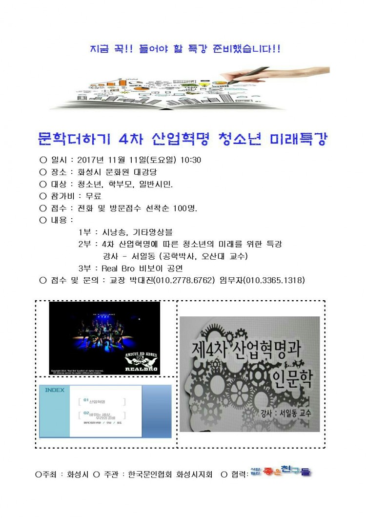 문학더하기 4차산업혁명 청소년문학특강 페이지 정보 작성자 화성예총 댓글 0건 조회 3,178회 작성일 : 17-11-07 본문 문학더하기 4차산업혁명 청소년문학특강 목록 이전글화성음학협회] 난파탄생 120주년 기념음악회 18.04.02 다음글제4회 화성시 전국 청소년 국악경연대회 17.10.30 댓글목록 댓글목록 등록된 댓글이 없습니다.