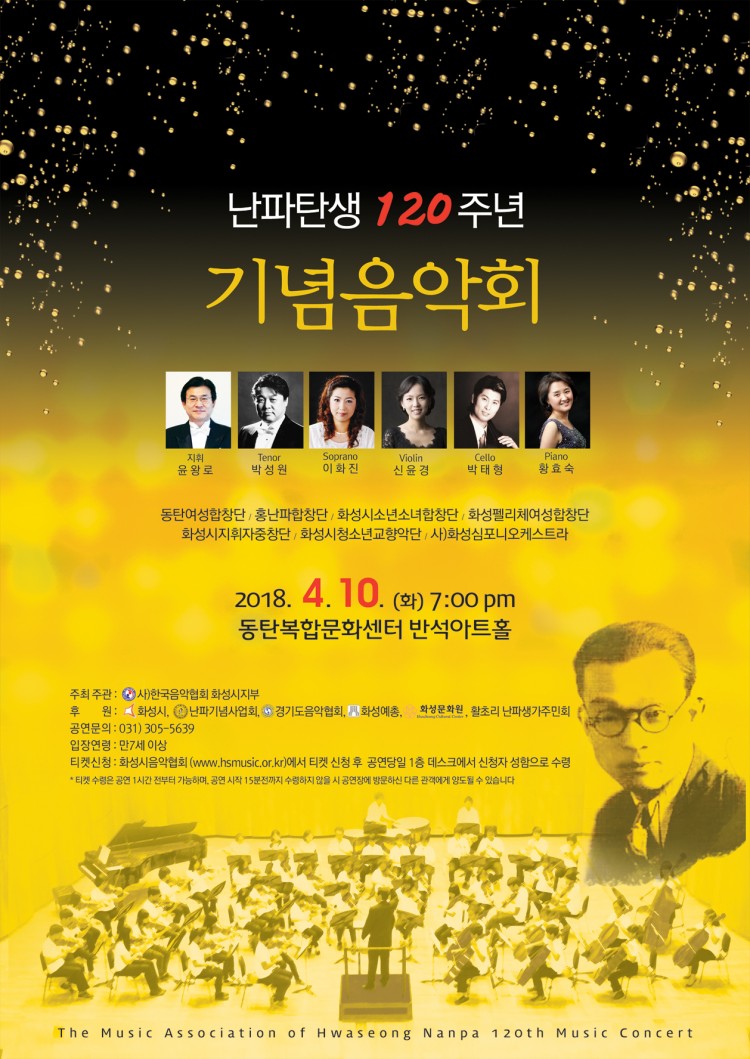 난파탄생 120주년 기념음악회 전석 무료 공연으로 만 7 세이상 입장가 /공연 문의 031)305-5639 티켓은 화성시음악협회 홈페이지(www.hsmusic.or.kr)에서 신청하면 됩니다~ 난파기념음악회 홍보 부탁드립니다 감사합니다^^ |