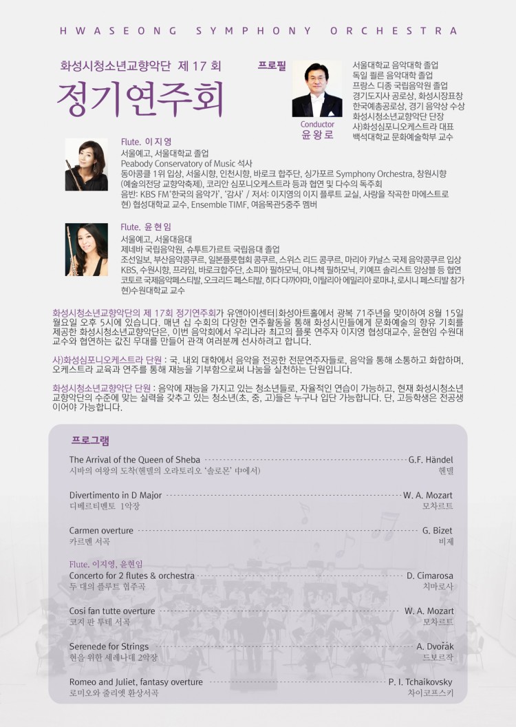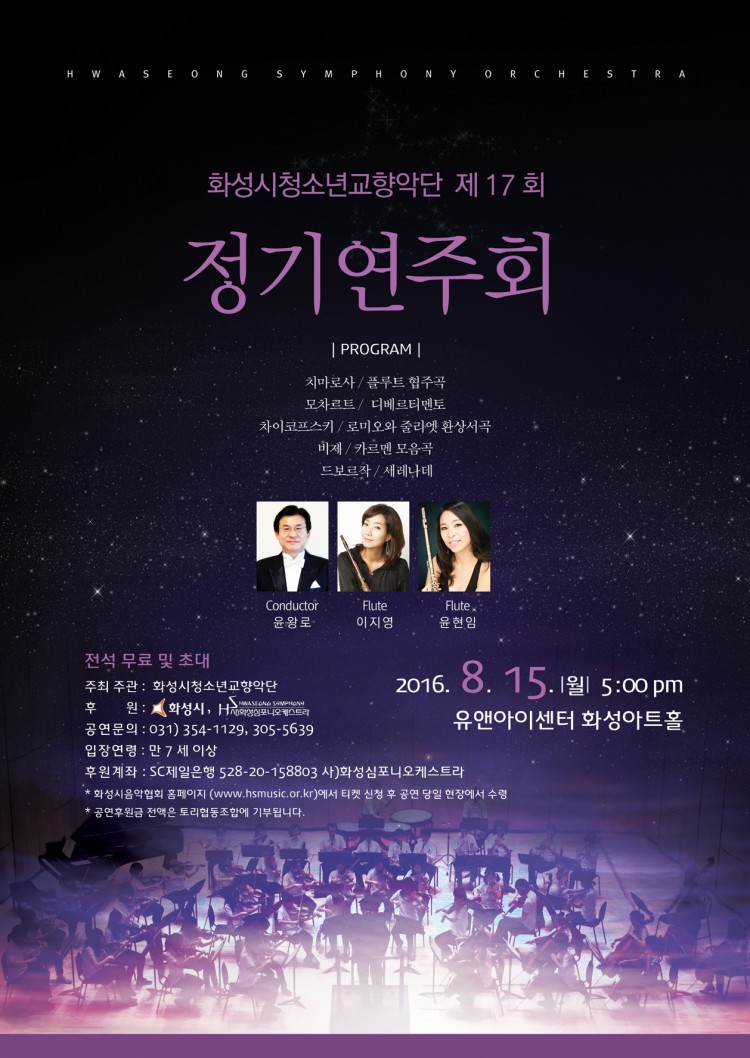 화성시청소년교향악단 제17회 정기연주회가 2016년 8월 15일(월) 5:00 pm 유앤아이센터 화성아트홀에서 개최됩니다~~