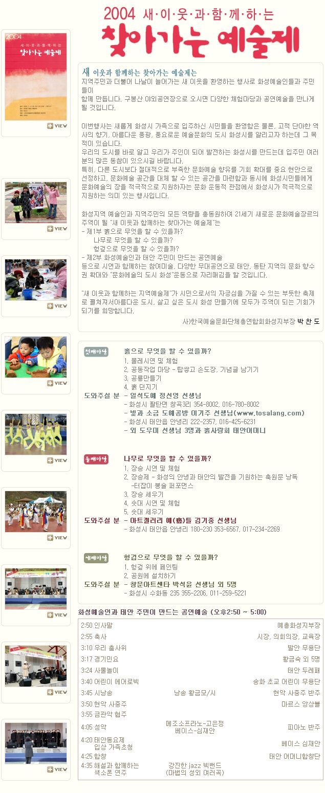 2004-찾아가는예술제 페이지 정보 작성자 화성예총 댓글 0건 조회 2,255회 작성일 : 15-02-26 본문 2004-찾아가는예술제 목록 이전글2017 화성시 문화예술육성지원 공모사업 17.01.17 다음글일제의 침략사 사진전 15.02.26 댓글목록 댓글목록 등록된 댓글이 없습니다.