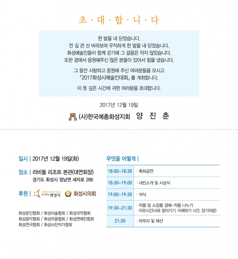 2017화성시예술인대회 페이지 정보 작성자 화성예총 댓글 0건 조회 5,109회 작성일 : 17-12-18 본문 2017화성시예술인대회 목록 이전글화성예총 직원채용공고 17.12.28 다음글찾아가는 문화예술교육공연 공연팀 모집 계획 17.11.01 댓글목록 댓글목록 등록된 댓글이 없습니다.