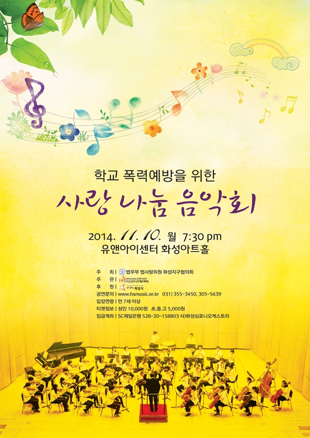다음달 10일, 유앤아이센터 화성아트홀에서 학교폭력예방을 위한 사랑나눔음악회가 열립니다. 올바른 의식과 가치관으로 사회규범 체계의 확립 및 찾아가는 법 교육등을 통해 청소년들에게 법과 질서의 중요성을 일깨우는 법무부 법사랑위원 화성지구협의회와 사)화성심포니오케스트라, 화성시청소년교향악단이 매년 개최하는 이번음악회에서는 비발디 사계 (바이올린 김민주 협연), 청산에 살리라 (바리톤 김준호 협연), 필링스 (협연 윤왕로),드로브작 8번 교향곡등으로 꾸며질 예정입니다.