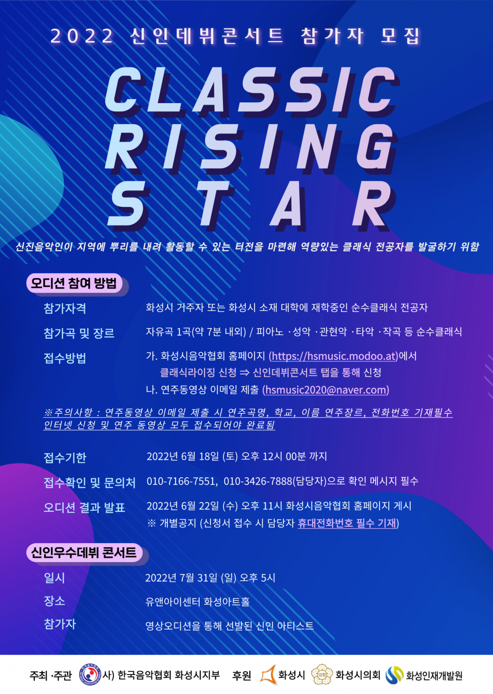 - 다음글화성시음악협회 5월29일 [2022 화성시음악협회 영재우수콘서트] 개최 22.05.20