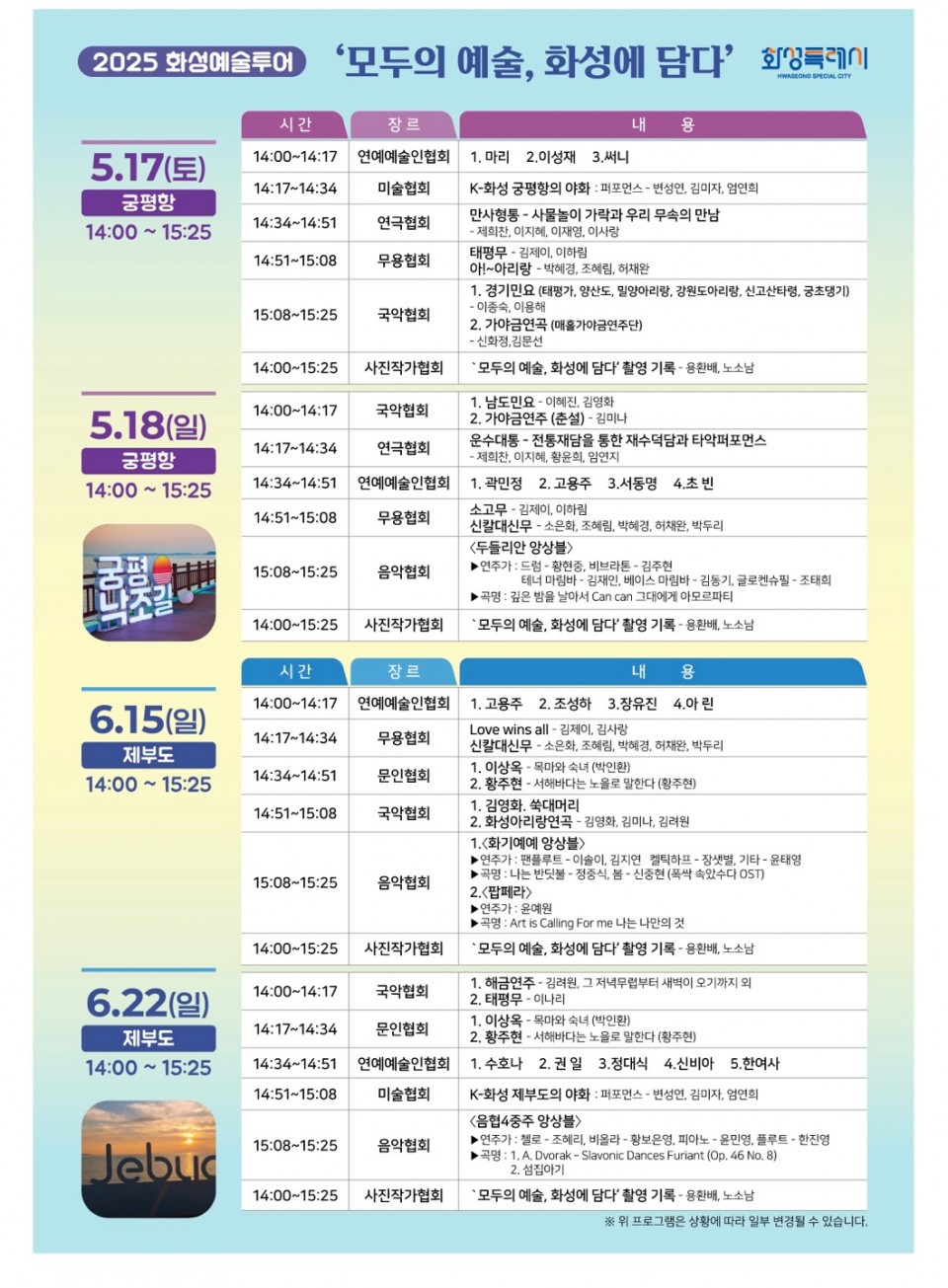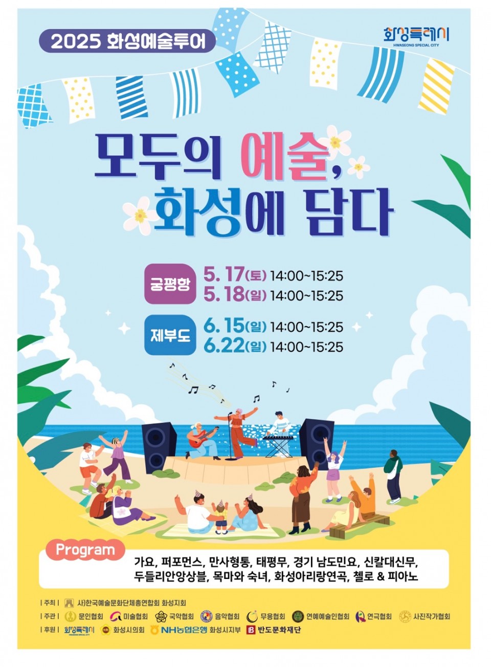 2025 화성예술투어 `모두의 예술, 화성에 담다' 페이지 정보 작성자 최고관리자 댓글 0건 조회 1,758회 작성일 : 25-05-14 본문 2025 화성예술투어 `모두의 예술, 화성에 담다' 목록 이전글제11회 경기실버국악제 25.05.20 다음글(사)화성예총 사무국장 채용 공고 (응시원서 마감일 : 2024년 11월16일(토) 18:00 까지) 24.11.11 댓글목록 댓글목록 등록된 댓글이 없습니다.