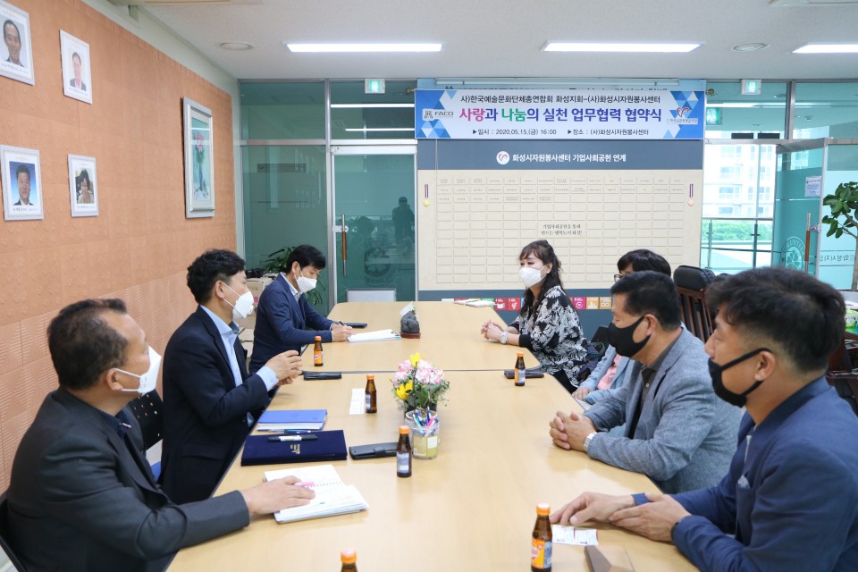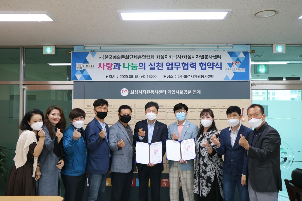 5월 15일 오후 4시 화성시 향남자원봉사센터에서는 사)한국문화예술총연합회 화성지회(이하 한국예총 화성지회)와 사단법인 화성시자원봉사센터는 상호존중과 신뢰를 바탕으로 자원봉사활동의 발전과 활성화를 도모하고 한국예총 화성지회의 전문역량과 문화예술 공헌사업에 적극 협력하여 지역사회발전을 위한 공동 업무 협약식을 체결하였다.