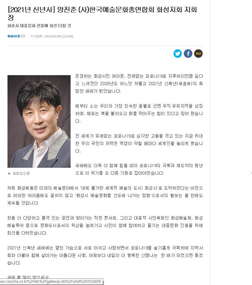 [2021년 신년사] 양진춘 지회장 - 화성시 대중문화 진흥에 최선을 다할 것