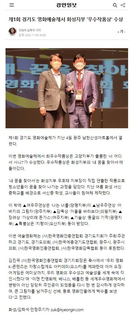 제1회 경기도 영화예술제서 화성지부 '우수작품상' 수상 페이지 정보 작성자 최고관리자 댓글 0건 조회 3,315회 작성일 : 22-11-08 본문 제1회 경기도 영화예술제서 화성지부 '우수작품상' 수상 (kyeongin.com) 목록 이전글2022년 故이동안 춤 전승교육사업 - 추모제 11월 7일(월) 22.11.08 다음글2022 지역예술발전을 위한 (사)화성예총과 화성시의회 교육복지위원회와의 간담회 개최 22.09.14 댓글목록 댓글목록 등록된 댓글이 없습니다.