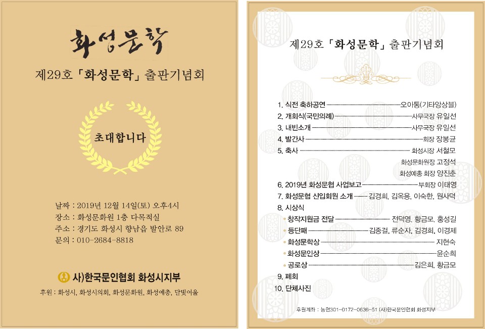 제29호 화성문학 출판기념회 페이지 정보 작성자최고관리자 댓글 0건 조회 1,266회 작성일 19-12-06 17:33 본문 여러분의 관심과 성원 부탁드립니다 목록 이전글2019 토요상설공연 1 19.12.17 다음글제17회 전국 화성 정조 '효' 백일장 시상식 19.12.06 댓글목록 댓글목록 등록된 댓글이 없습니다.